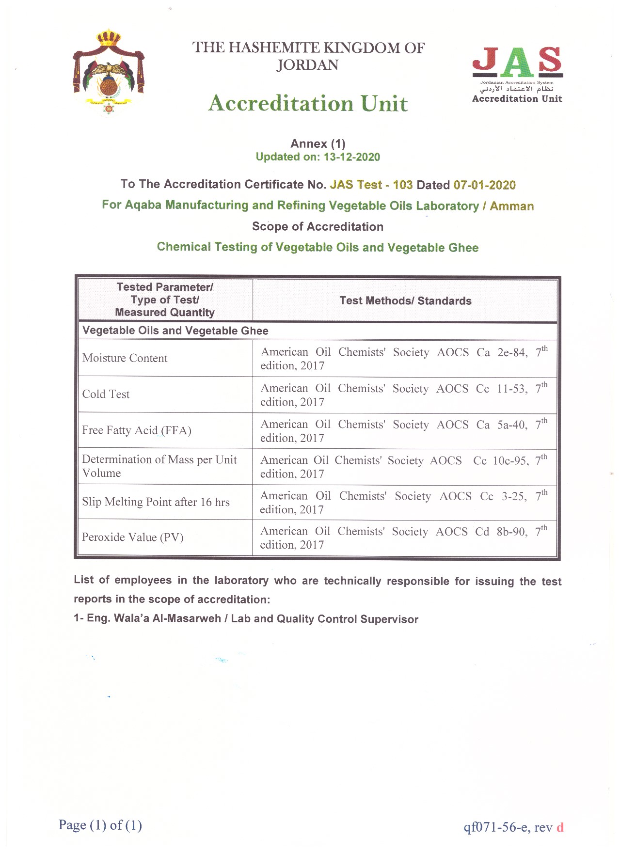 - ISO 17025:2017 by JAS:AU & ILAC (Chemical and Physical Testing of Vegetable Oils and Vegetable Ghee),