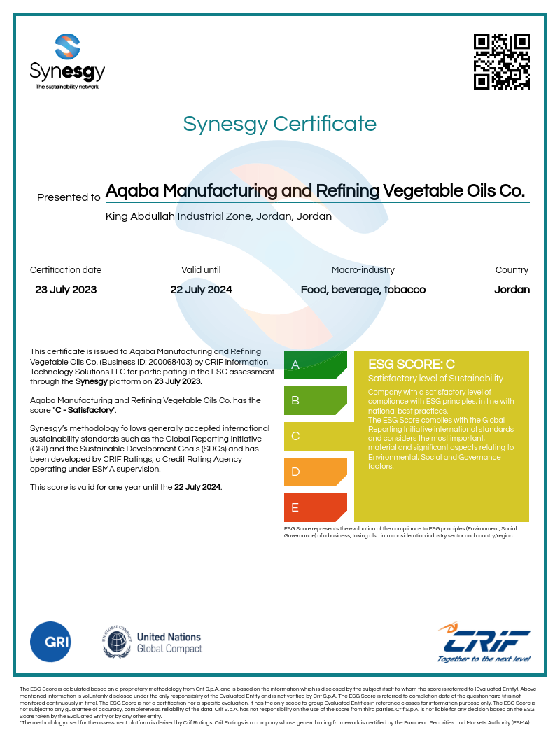 At Aqaba Manufacturing and Refining Vegetable Oils Company, we are devoted to Food Safety and Quality Management. Thus, we have established a rigorous quality assurance system comprised of stringent policies and procedures designed to guarantee a high standard and safe product that follows with the food industry worldwide quality standards.