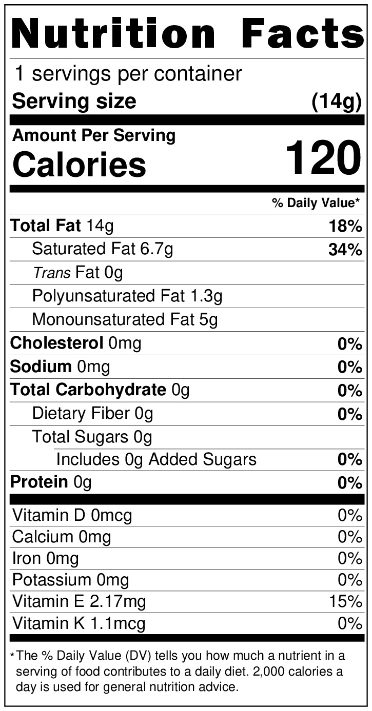 Ingredients: Non-Hydrogenated Palm Olein, Anti-Oxidant (T.B.H.Q.).