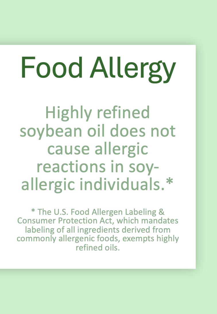 - Highly refined soybean oil does not cause allergic reactions in soy-allergic individuals.* (* The U.S. Food Allergen Labeling & Consumer Protection Act, which mandates labeling of all ingredients derived from commonly allergenic foods, exempts highly refined oils.)